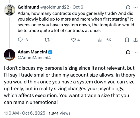As a successful futures trader Adam Mancini wrote, each level of size requires a different psychology.